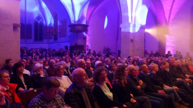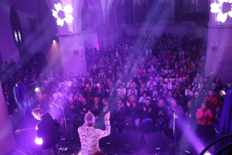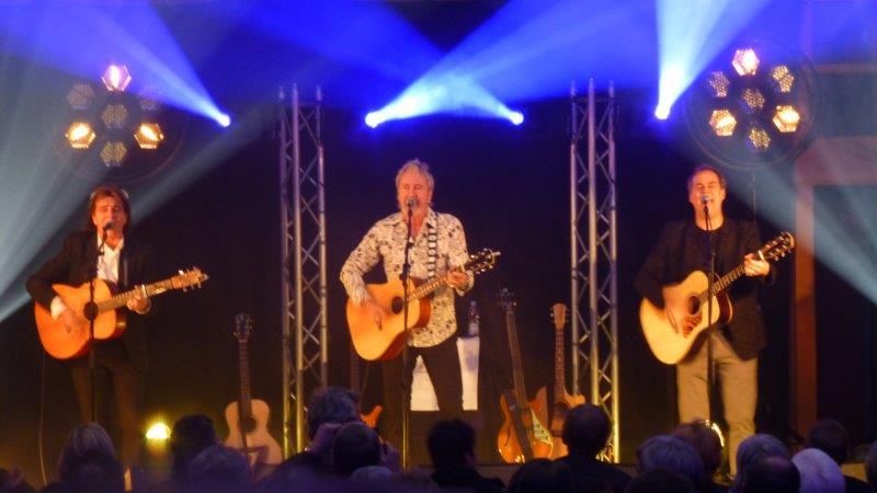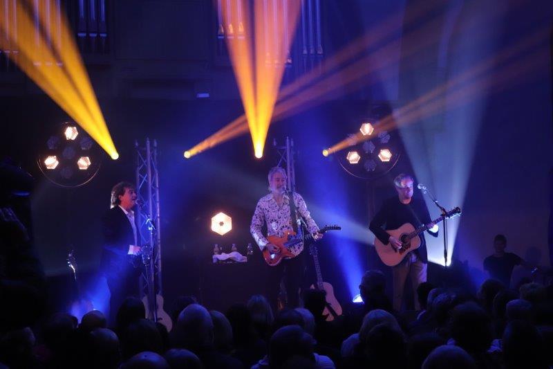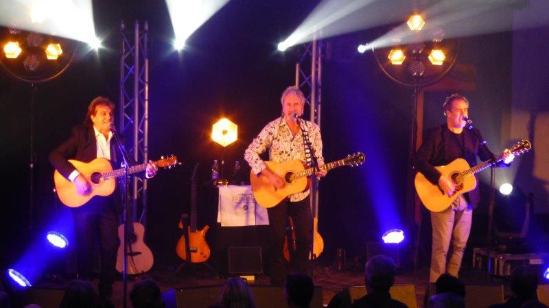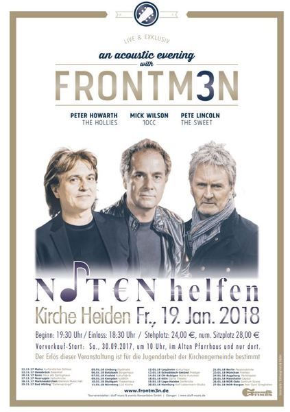 Stimmungsvoll ausgeleuchtete Gewölbedächer und brillante Musiker, so lässt sich das Benefizkonzert der Frontm3n mit wenigen Worten umschreiben. Schon nach dem zweiten Song sprang der Funke über. Pete Lincoln, Mick Wilson und Peter Howarth hatten sichtlich Spaß an dem Spiel mit dem Publikum. Gaben sie doch die schönsten Songs ihrer Ursprungsbands Hollies, Sweet und 10CC in der Heidener Dorfkirche zum Besten. Vor 24 Jahren begegneten sich die Drei bei Sir Cliff Richard. Fortan standen sie immer mal wieder gemeinsam auf der Bühne. Vor ca. 2 Jahren wurde dann der Grundstein für Frontm3n gelegt. Dass Frontm3n musikalisch echt was drauf hat, das haben sie auch bei dem Notenhelfen-Konzert bewiesen. Entlockten sie doch ihren Gitarren die phantastischten Töne und verzauberten zusammen mit ihren außergewöhnlichen Stimmen das Publikum. Da leuchteten bei „The air that I breathe“ die Handytaschenlampen auf und der Refrain wurde kräftig mitgesungen.